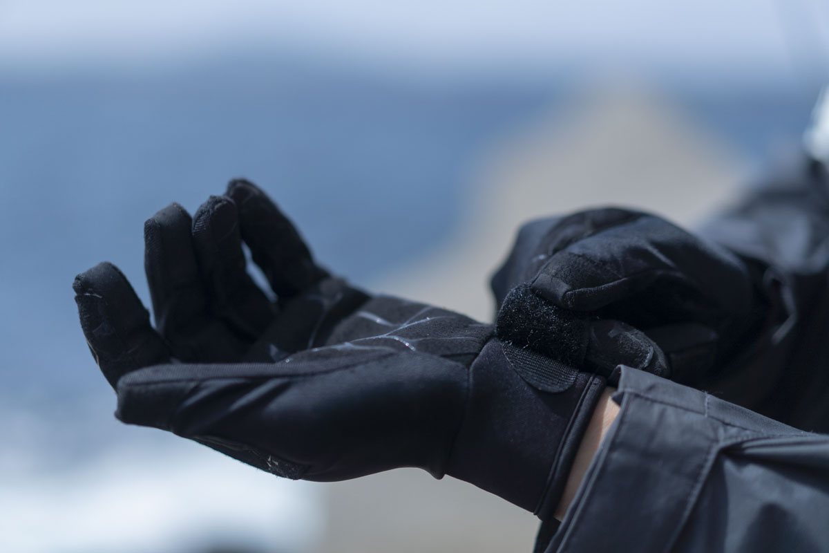 大型青物とのファイトや、フルキャストを繰り返すロックショアシーンを想定し、手首部分にはホールド性に優れた幅広のベルクロを採用。