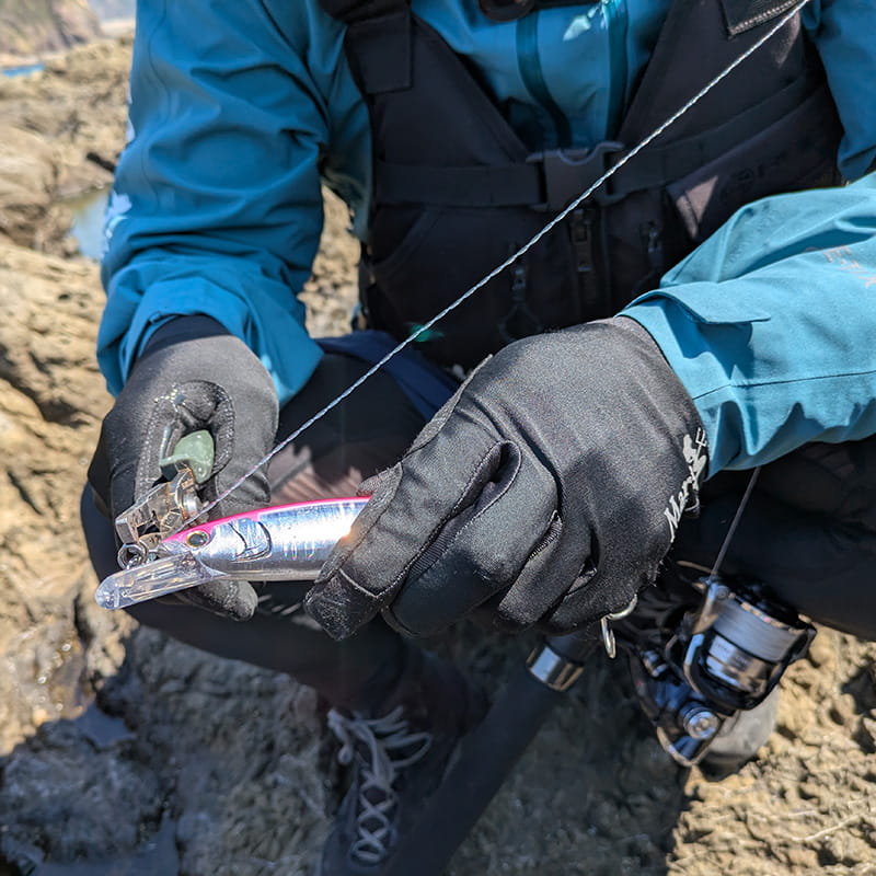 ごわごわとしたグローブでは指先の感覚がわかりにくくルアー交換などの細かい作業はもちろん、キャストですらやりにくいときもあります。